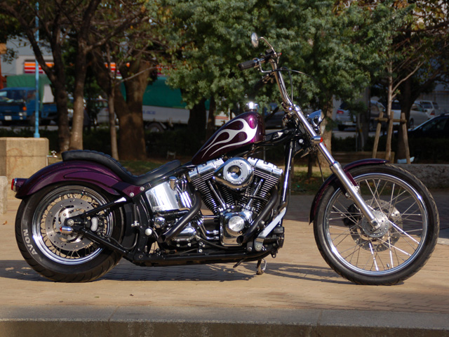 ほぼノーマルの状態で持ち込まれた、100周年アニバーサリーモデルのヘリテイジ(写真右下)を大胆にスリムなチョッパーにリニューアルしました。
