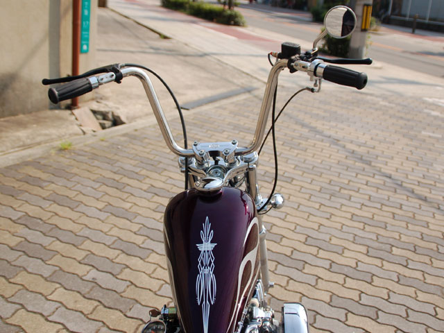 ハンドル周りは、ナロートリプルに合わせてFakeさんオリジナルの "GREASER BAR" とスイッチ。グリメカのマスターシリンダー。配線も中通しですっきりです。