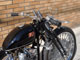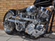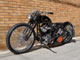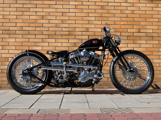 スプリンガーのトップブリッジと一体型に製作し低く構えたハンドル、ピーナッツタンクをロウマウント。WCC製をモディファイしたリアフェンダーを短めにセットし、迫力あるリアビューに仕上げました。カラーリングは黒にアイボリーでラインを入れ、タンクにオレンジとアイボリーでHDとレタリングが入ります。HDのオレンジとバーネット製スコーピオンクラッチのオレンジがとても相まっています。ブレーキ系はPMでまとめ、74スプリンガーにF.21"×R.18"100本スポークホイールとAVONのタイヤの組み合わせがなんとも印象的です。