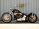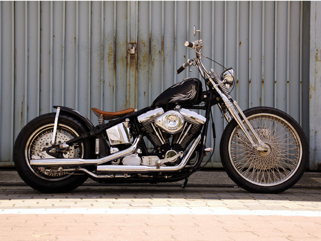 120本スポークホイールに74スプリンガーのセットアップ。 7インチのライザーにスパーバー。ビレットのマスターシリンダーとレバー、ミニスイッチ、配線中通しでハンドル周りはすっきりしています。グリップはPMで握り易いです。 スポタンとフラットフェンダーは艶あり黒に塗装後、白のピンストでさらっと柄を入れてもらいました。ナンバープレートはサイドに移設し、アールを付けています。 モダンな物とクラシカルな物との組合せがカッコイイ1台です。