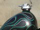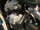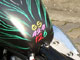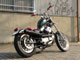 まず、リアの車高を11インチのサスでローダウン。そして、フロントフォークを6インチオーバーにする事でフロントのかち上がったB級チョッパー的なシルエットを作っています。サンダーヘッダーマフラーを流用した、微妙に上向きかげんのマフラーが XL1200S のカスタムではあまり見かけないお馬鹿なニュースタイル(オーナー曰く)になっているのではないでしょうか!?