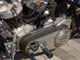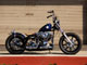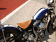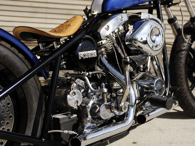BDLの3インチオープンベルト。ビレットのインナープライマリーがメカメカしく、剛性UPに一役かっています。セルモーターをかわすため、小振りのバレルタイプのOILタンクをワンオフで製作しました。 オーナーの友人TONY氏がカービング仕上げした本皮のサドルシートは、2本のシートサスペンションが支えます。