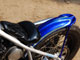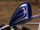 タンクはスポタンをワンオフ製作。オーナーの好みに合わせ、縦を足して横を詰めました。リブ付きのリアフェンダーはフェンダーストラットと綺麗なRが出るように一体物で製作しました。キャンディーブルーにシルバーとゴールドのリーフでスキャロップをアレンジした柄を入れました。